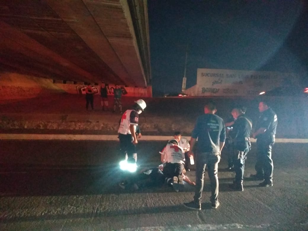 Por resistirse a ser despojado de sus pertenencias de valor, un hombre fue apuñalado y él, para tratar de evitar que le robaran sus pertenencias, se lanzó de lo alto del puente, ubicado en Circuito Interior y carretera a Matehuala. Los criminales causantes del hecho, se dieron a la fuga. La víctima fue auxiliada por algunas personas que el vieron caer y llamaron al 911 de atención a emergencias.