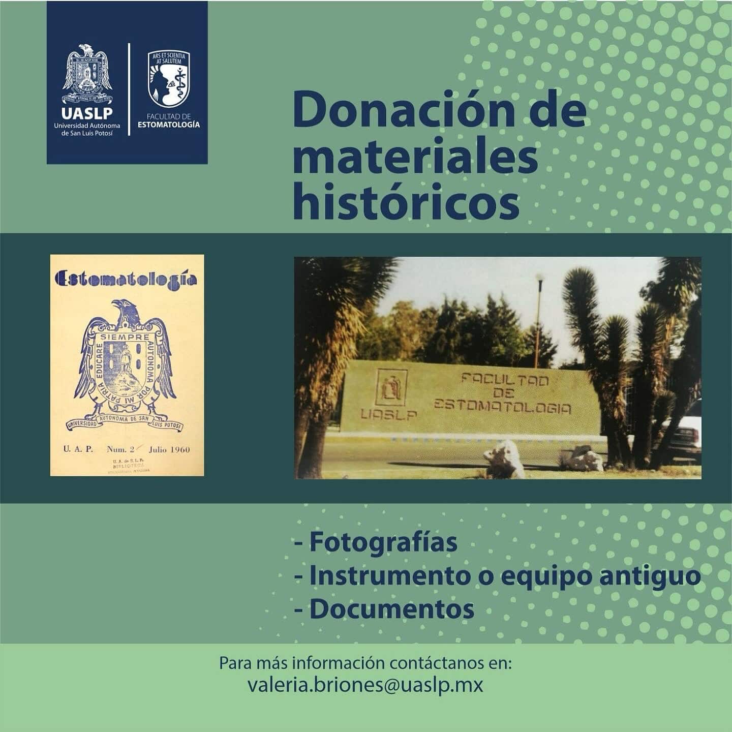 Por ello, se invita a egresados, profesionales de la odontología y a la comunidad potosina a contribuir con la donación de materiales históricos que documenten la enseñanza de la estomatología en la UASLP.