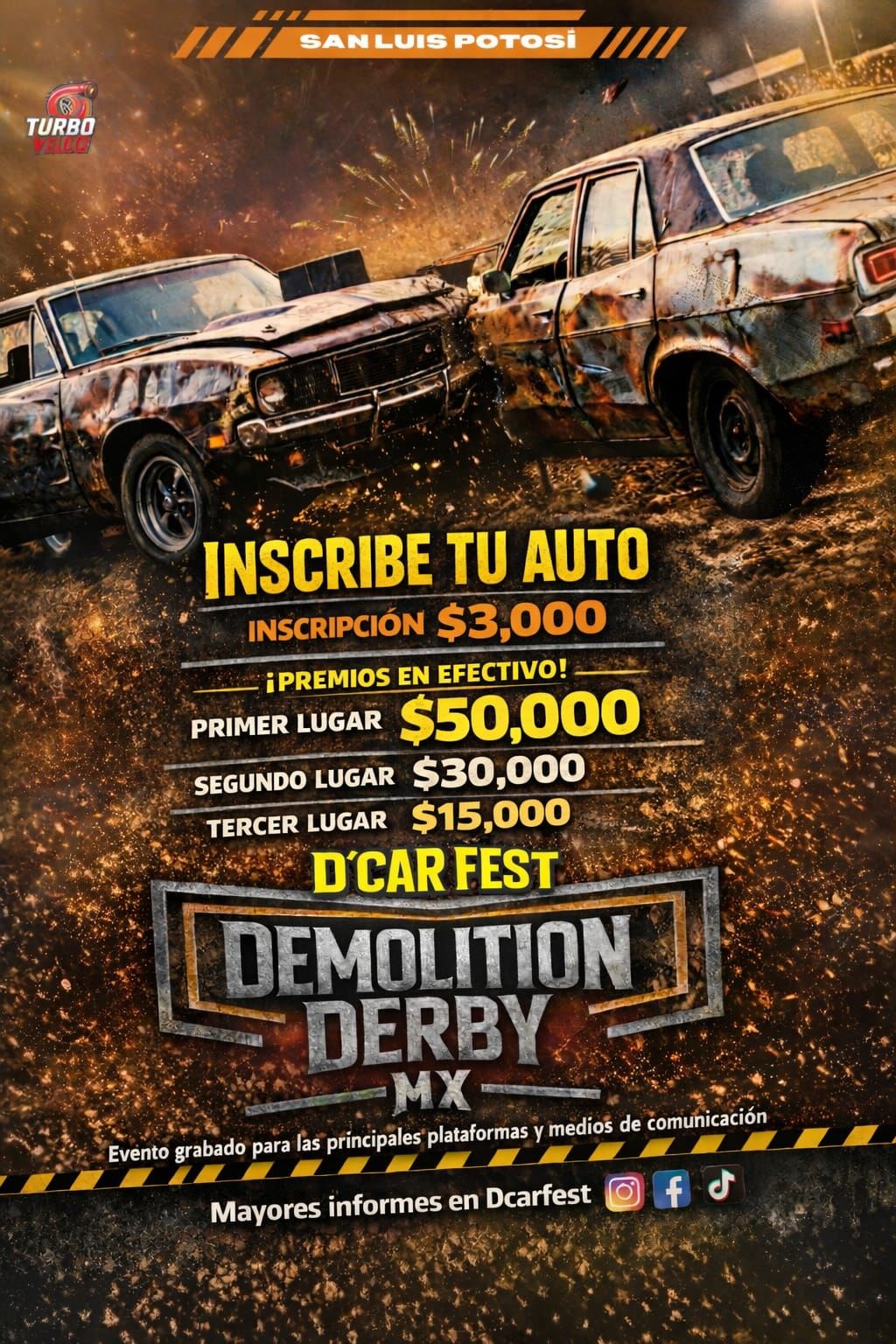Adrenalina, motores y choques controlados serán parte del D’Car Fest Demolition Derby MX, que se llevará a cabo el próximo 8 de marzo a las 12:00 horas en las instalaciones de la Feria Nacional Potosina (Fenapo).