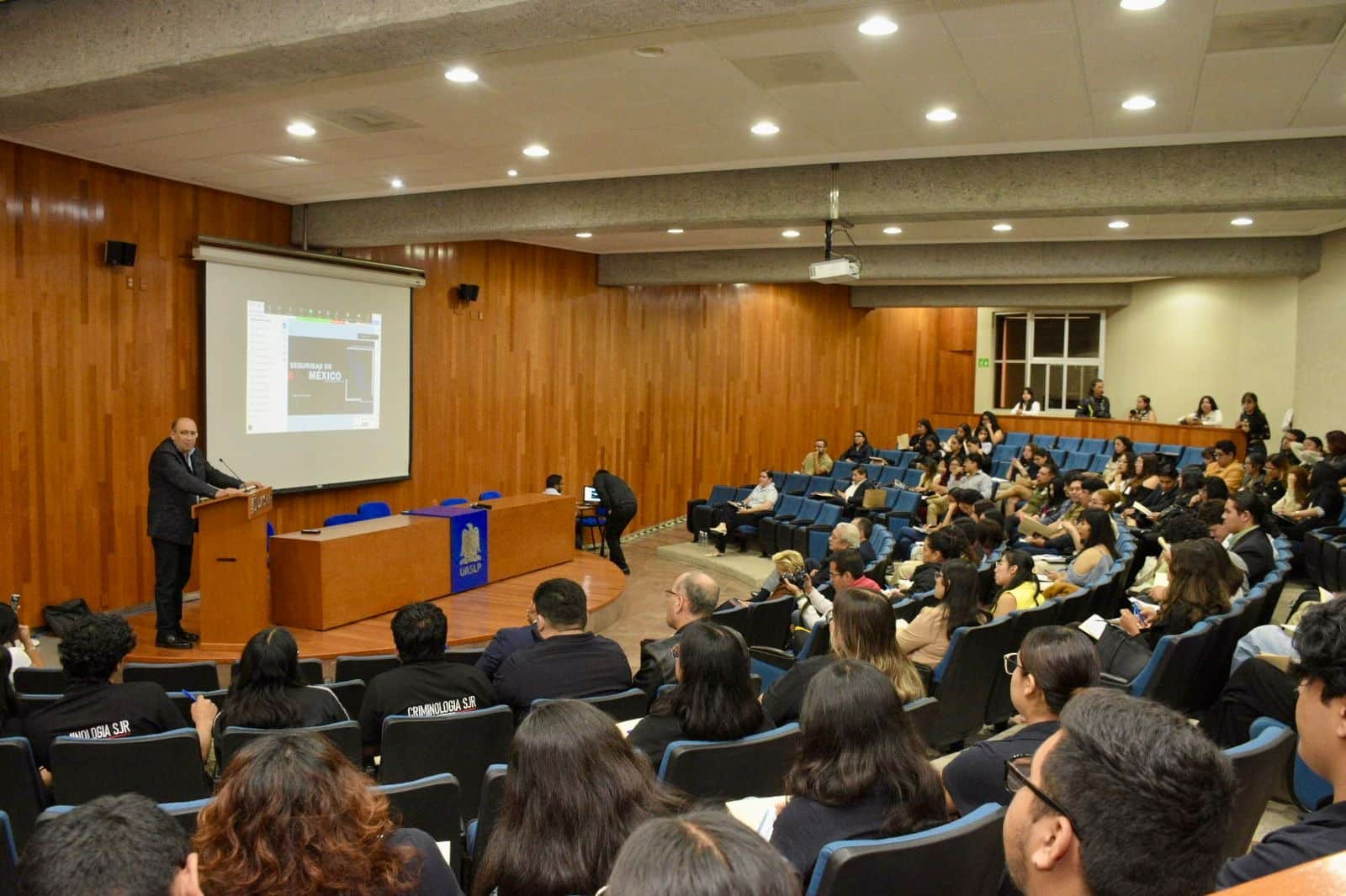 Asimismo, reconoció el interés de las y los estudiantes que participan en este foro, el cual sitúa a la Universidad Autónoma de San Luis Potosí como un espacio idóneo para generar conocimiento y herramientas mediante mesas de debate, conferencias y diálogos especializados. “Los exhorto a aprovechar la experiencia de los docentes que compartirán sus reflexiones y propuestas; de ese intercambio se nutre la vinculación entre academia y vida real”, agregó.