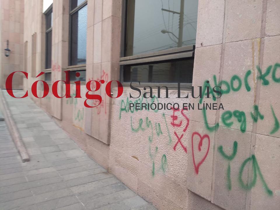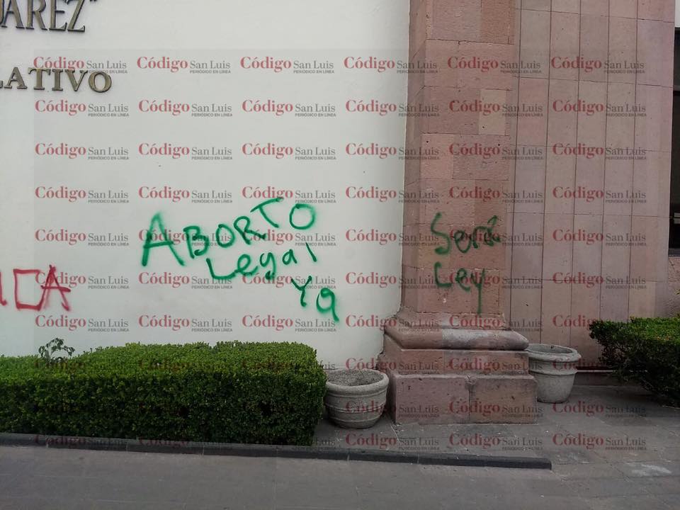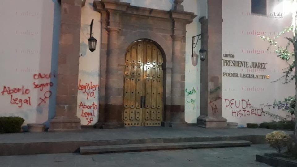 Con pintura roja y verde, se leían consignas de “Aborto legal ya”, “sera ley” y “deuda histórica”, todas a favor de la aprobación en San Luis Potosí del aborto. Se cree que fueron realizadas alrededor de las 4:00 de la mañana, pero no fueron vistas hasta que los primeros rayos del sol iluminaron el recinto legislativo.