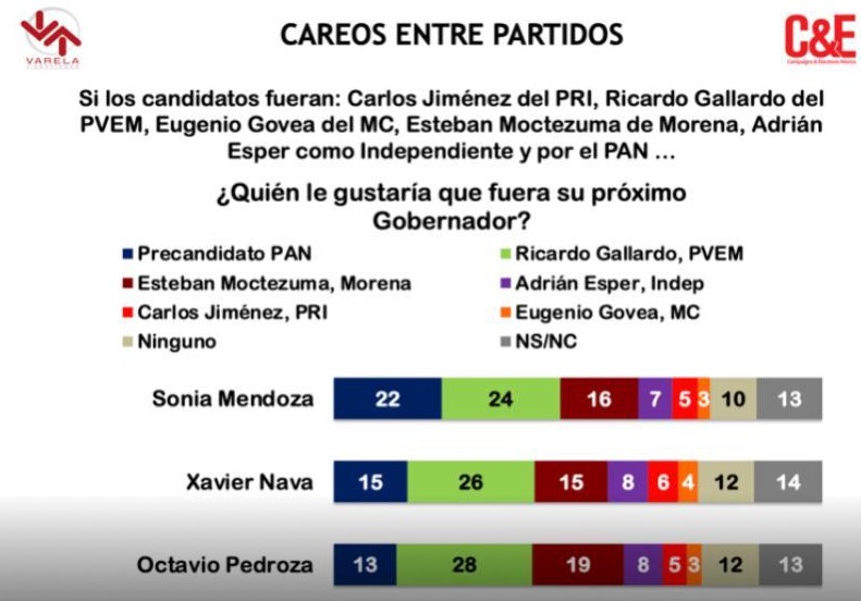 En los tres escenarios, Gallardo supera a panistas: Con 24% contra 22 si la candidata fuera Sonia Mendoza; con 26% contra 15, si su rival fuera Xavier Nava; y con 28% contra 13, si fuera Octavio Pedroza.