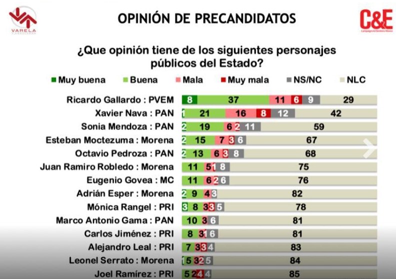 El ejercicio también señala que Gallardo tiene el mayor porcentaje de BUENA y MUY BUENA opinión entre la ciudadanía, con un 45%, muy por delante del panista Nava, quien se quedó con 22%.