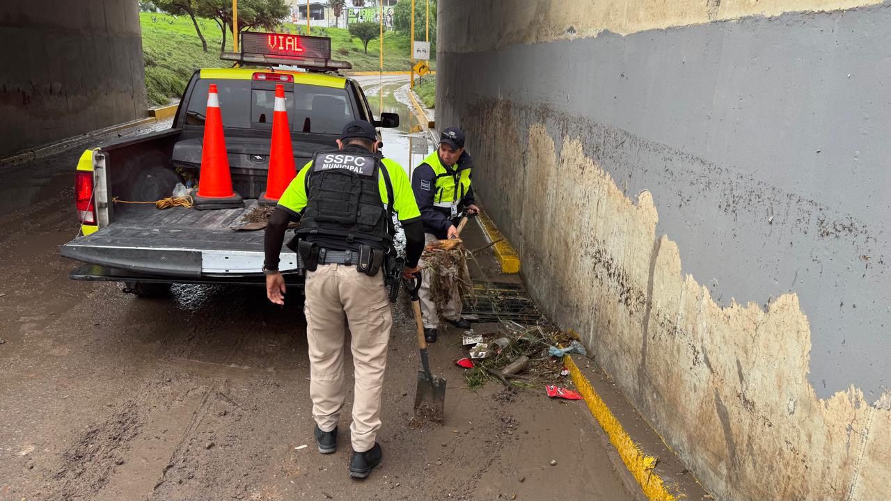 Durante el operativo, elementos de Policía Vial mantienen cierres momentáneos para permitir que el personal de limpieza trabaje sin riesgo. Se retiran residuos, tierra y basura acumulada que podrían representar un peligro para la circulación una vez que el desnivel sea reabierto.