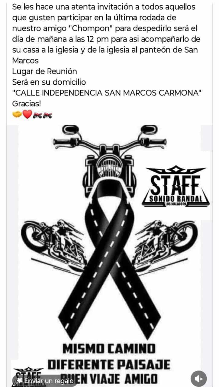 La mañana de este lunes, decenas de repartidores de plataforma se movilizaron en una rodada fúnebre para dar el último adiós a Juan Cristóbal Montalvo, conocido afectuosamente como «Chompón». El contingente partió poco después de las 11:00 horas desde el estacionamiento de Plaza El Paseo en la capital potosina, recorriendo la avenida Himno Nacional con destino a la comunidad de San Marcos Carmona, en el municipio de Mexquitic de Carmona, donde se realizaron los servicios funerarios y la misa de cuerpo presente.