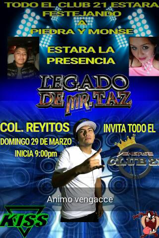 El cartel reza que “todo el Club 21 estará festejando a Piedra y Monse”; para amenizar estará Legado de Mr. Taz con todo su repertorio musical y comenzará a partir de las 21:00 horas en Los Reyitos.