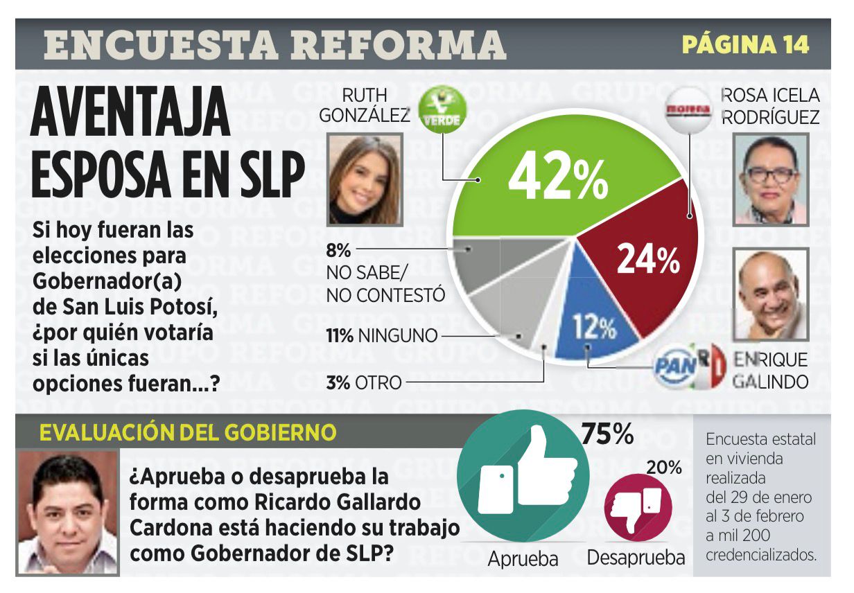 A través de una encuesta realizada por dicha casa editorial, respondiendo a la pregunta «Si hoy fueran las elecciones a Gobernador(a) de San Luis Potosí, ¿por quién votaría si las únicas opciones fueran…?», los resultados le dan clara victoria a Ruth González Silva, seguida por Rosa Icela Rodríguez Velázquez; dejando en tercer lugar al alcalde de la capital potosina, Enrique Galindo Ceballos.