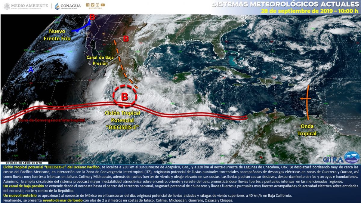El funcionario, indicó que de acuerdo a información del Servicio Meteorológico Nacional, estas condiciones serán generadas por la Tormenta Tropical Narda y sus bandas nubosas que interaccionarán con canales de baja presión en el noroeste y sureste de México, así como al Frente Frío Número 2, en el norte de Baja California y noroeste de Sonora.
