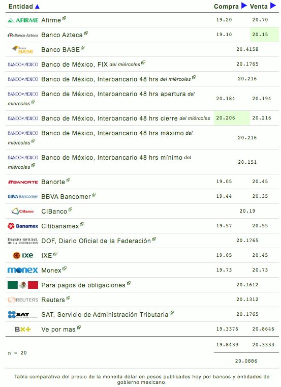 El dólar continúa con su racha a la baja y se cotiza en $20.12 pesos mexicanos Esto representa una disminución del 0.00147% con respecto al día de ayer.