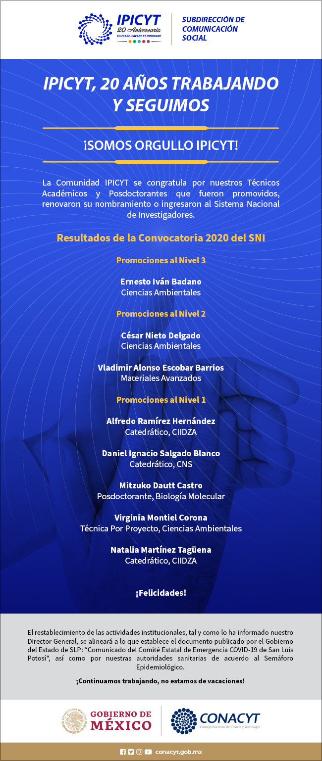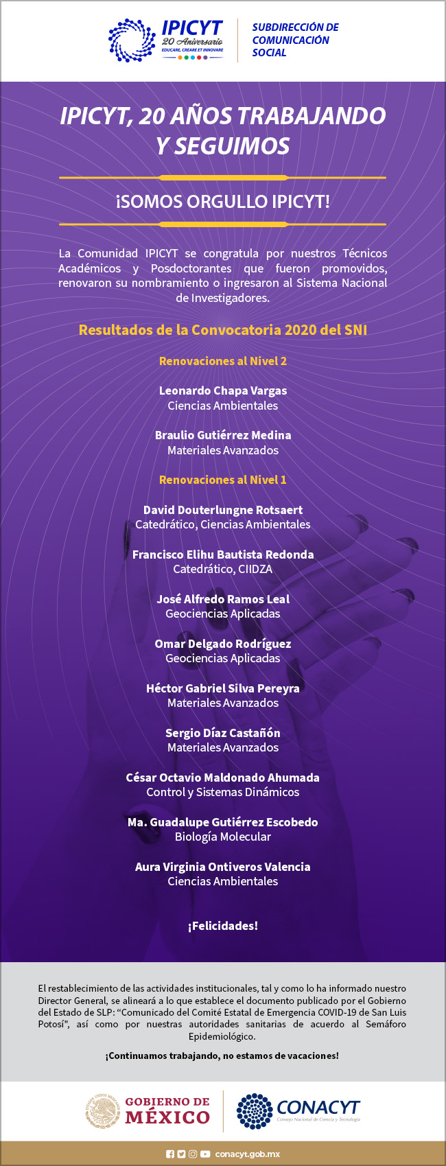 El cuerpo de investigadores y técnicos académicos del Instituto Potosino de Investigación Científica y Tecnológica, A.C. (IPICYT), continúa consolidando su membresía en el Sistema Nacional de Investigadores (SNI), máximo sistema de investigación de México, ya que 26 de ellos fueron promovidos, ingresaron o renovaron en el Sistema, indicó el doctor Luis Antonio Salazar Olivo, Director General del IPICYT.