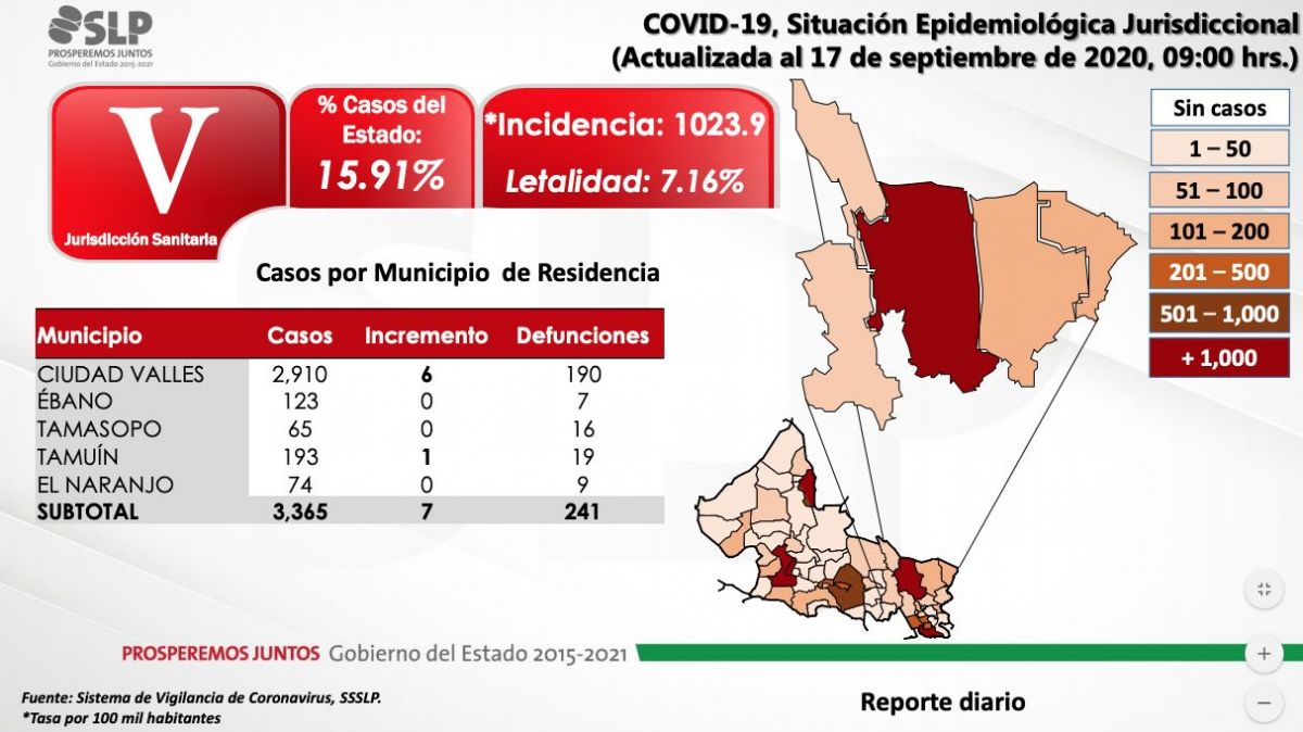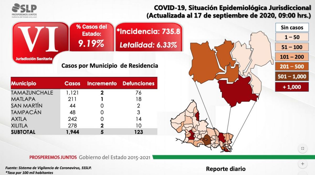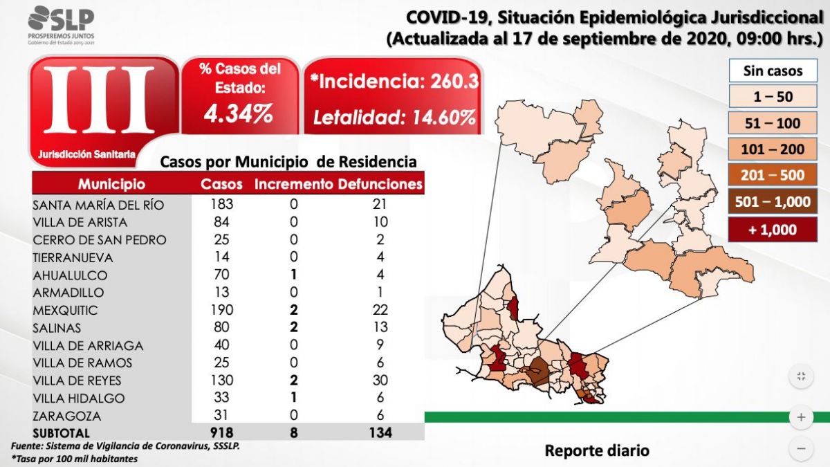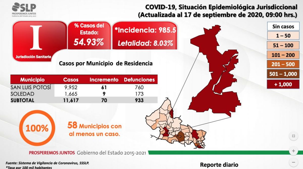 El Comité de Salud informa sobre el avance de la pandemia Covid-19 en SLP. En las últimas 24 horas confirmaron 95 casos positivos y 11 defunciones por la enfermedad. La tasa de letalidad en el estado se ubica en 8.09% por cada 100 infectados.