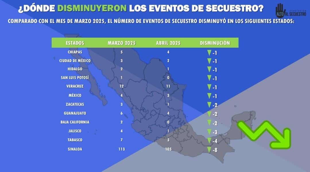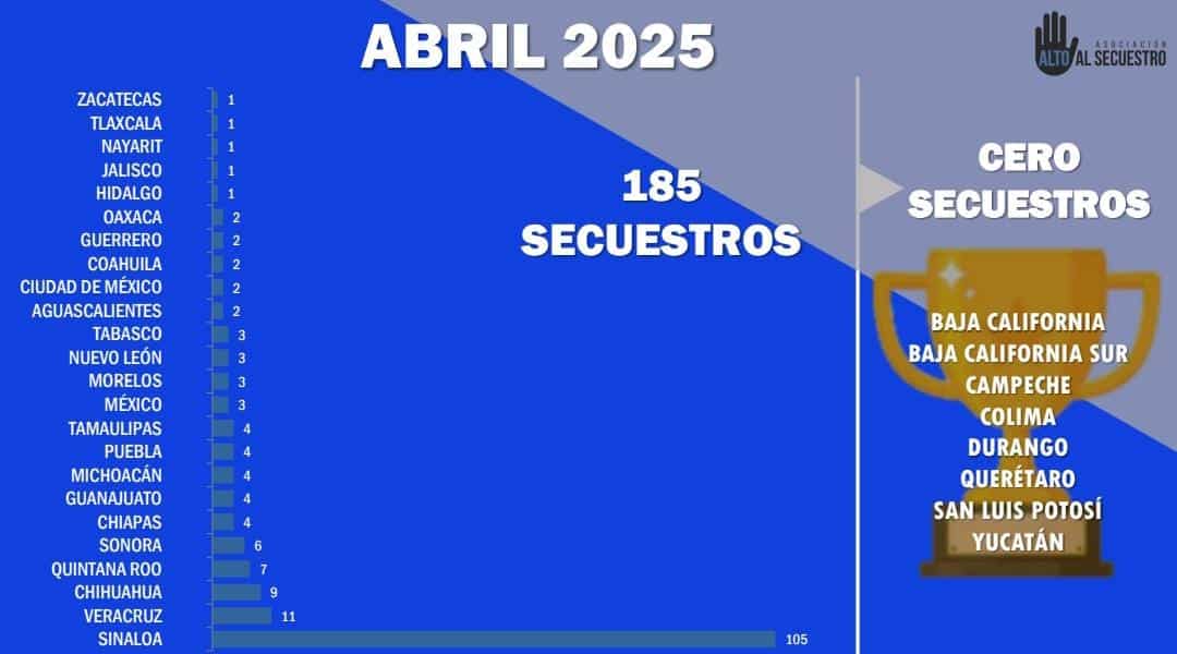 Junto con San Luis Potosí, también reportaron cero secuestros los estados de Baja California, Baja California Sur, Campeche, Colima, Durango, Querétaro y Yucatán. En contraste, Sinaloa encabezó la lista con 105 casos, seguido de Veracruz con 11 y Chihuahua con nueve, concentrando entre los tres más del 67% de los secuestros registrados a nivel nacional.