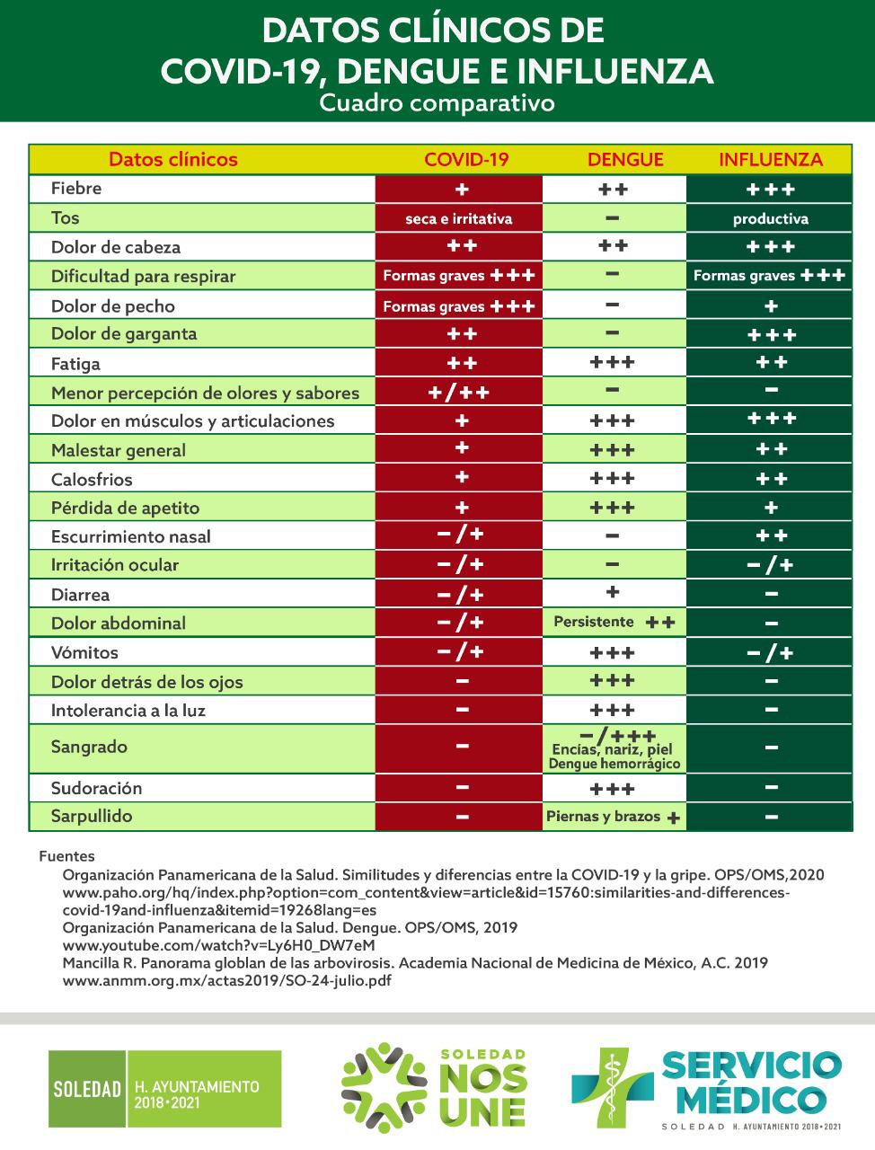 Con la finalidad de identificar síntomas que permitan un tratamiento adecuado, la dirección de Servicio Médico de Soledad, elaboró un cuadro comparativo de datos clínicos para distinguir entre influenza, dengue y COVID-19.