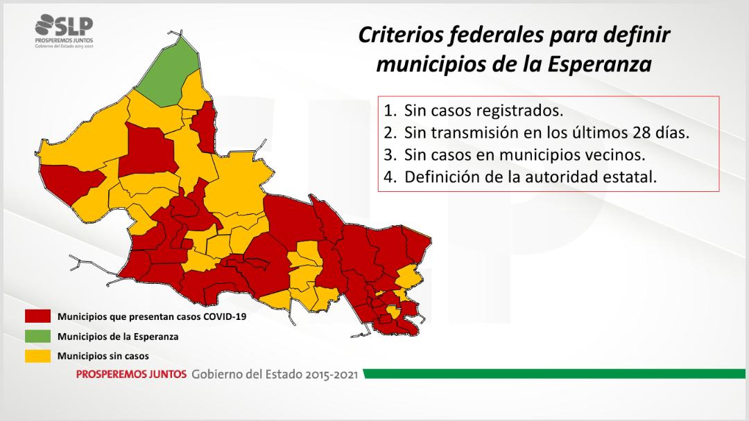 De acuerdo con el informe proporcionado por las autoridades estatales, a la fecha, únicamente Vanegas permanece como Municipio de la Esperanza, información que contrasta con los indicadores federales con fecha del 15 de mayo en donde se incluye a Matehuala, Charcas, Vanegas, Villa de la Paz, Catorce y Cedral como municipalidades que podrían comenzar con su retorno a la «nueva normalidad».