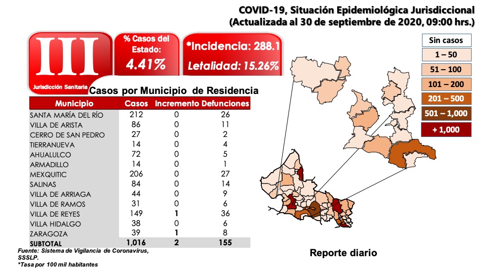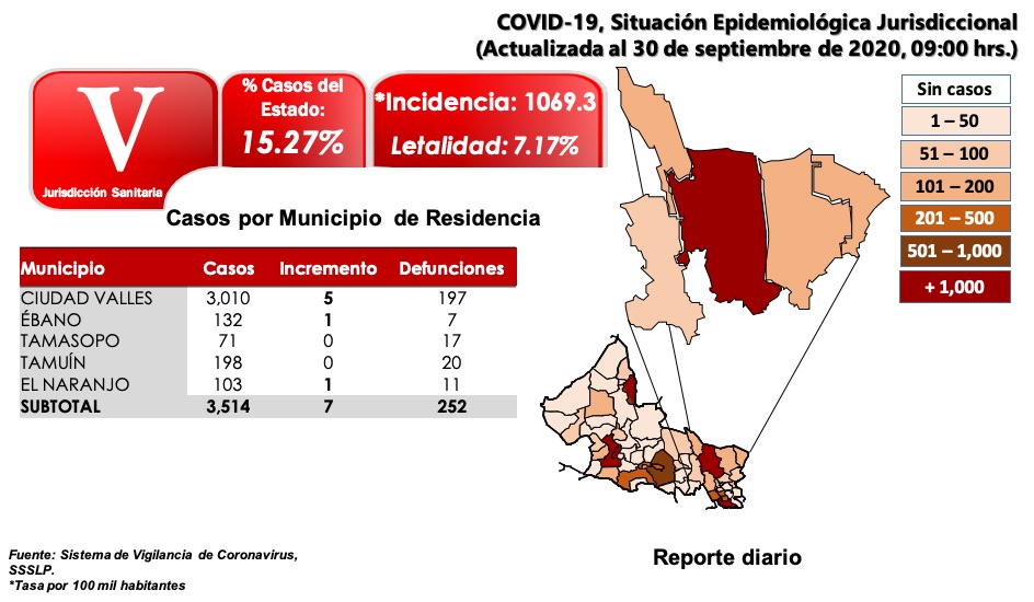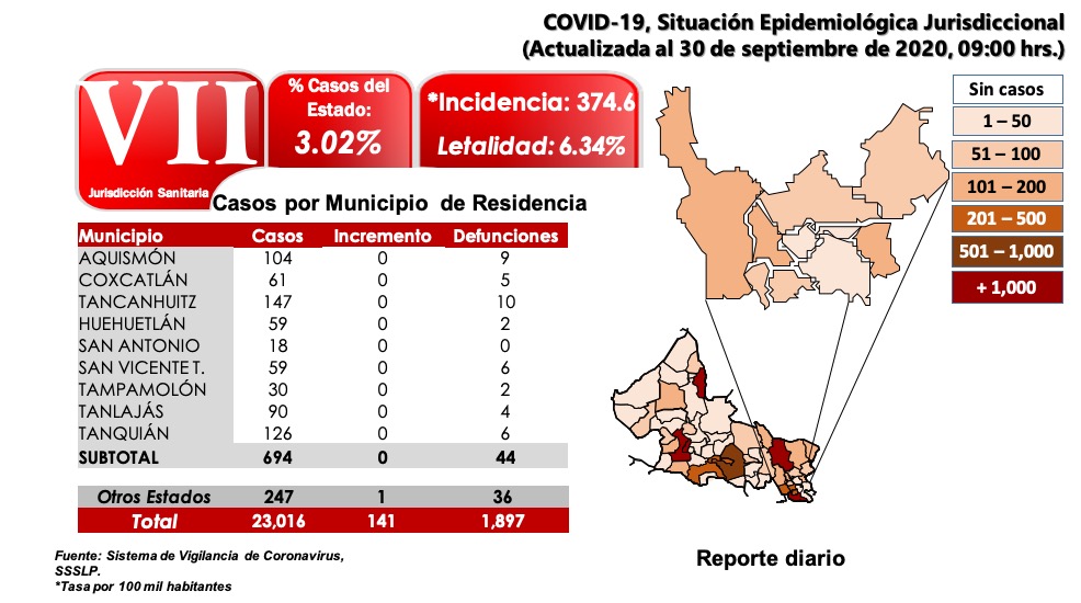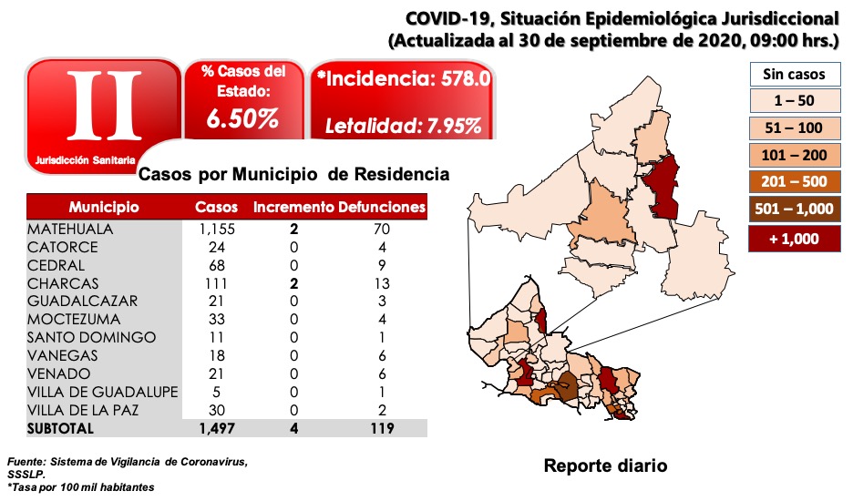 La entidad suma 23 mil 016 casos positivos y 1,897 defunciones desde el inicio de la pandemia. Los municipios con mayor actividad de contagios son SLP capital, Ciudad Valles y Soledad de Graciano.