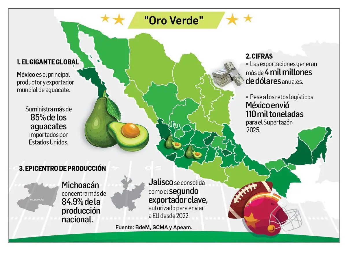 El aguacate mexicano reafirmó su posición como producto estratégico del agro nacional ante la alta demanda generada por el Supertazón, consolidándose como líder mundial con 28.5 por ciento de la producción global y exportaciones que podrían alcanzar los 4 mil millones de dólares en 2025, de acuerdo con datos del sector agrícola y del Grupo Consultor de Mercados Agrícolas (GCMA).