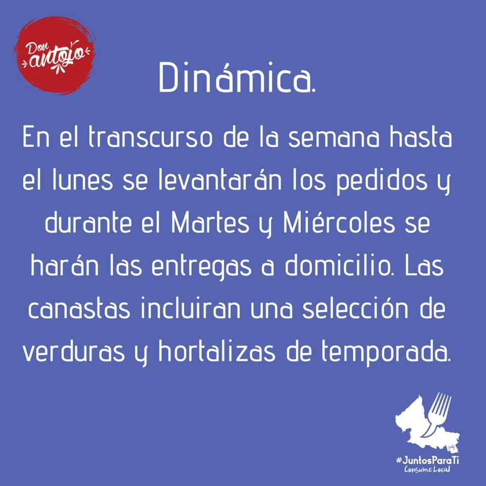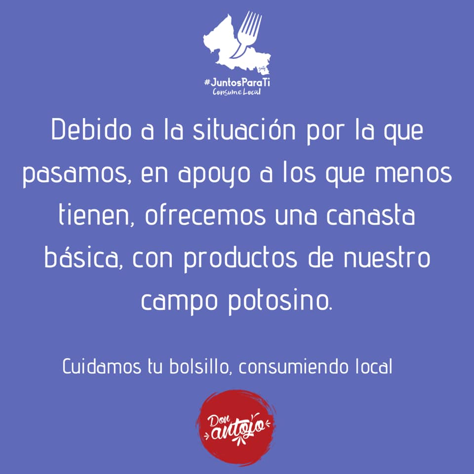 Debido a la contingencia y las medidas de distanciamiento social, el restaurante Don Antojo se ofrecen a surtir verduras y hortalizas directamente a tu domicilio. Esto con la finalidad de apoyar a los productores potosinos, quienes se han visto seriamente afectados por el Covid-19. Con el propósito de promover el consumo local y para evitar que salgas de casa a surtir el super fue que decidieron tomar la iniciativa.