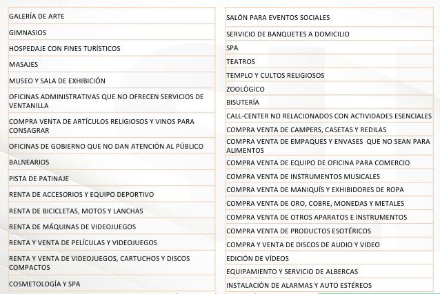 En contra parte, existe también una serie de actividades que se consideran como no esenciales y que deberán mantenerse inactivas durante este periodo, al menos, mientras lo dispongan las autoridades correspondientes. Su operación y el no acatamiento de las disposiciones oficiales podría conducir a sanciones o clausuras.