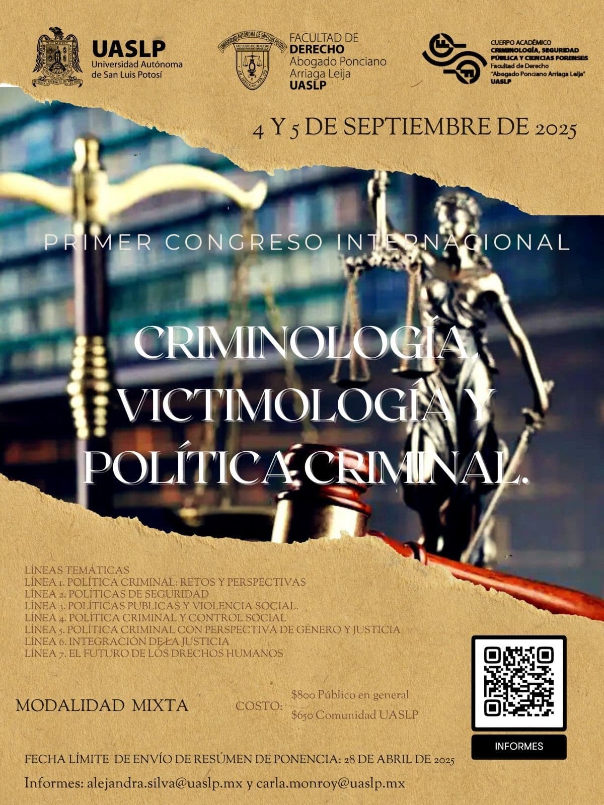 La Facultad de Derecho Abogado Ponciano Arriaga Leija de la Universidad Autónoma de San Luis Potosí (UASLP) anuncia la realización del Primer Congreso Internacional de Criminología, Victimología y Política Criminal, que tendrá lugar los días 4 y 5 de septiembre en la Unidad de Posgrado.