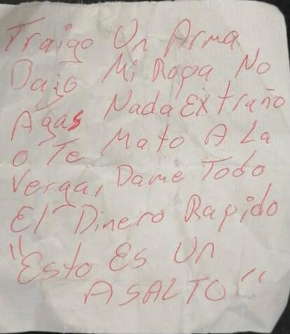 El evento inició cuando tres sujetos entraron a un Oxxo, localizado en avenida Chapultepec y uno de ellos entregó un recado a quien se encontraba en la caja, en el mismo señalaba que se trataba de un asalto y no hiciera nada extraño porque traía en la ropa un arma, dame todo el dinero rápido “Esto es un asalto”. La víctima obedeció y el tipo, junto con sus compinches se apoderaron del efectivo.