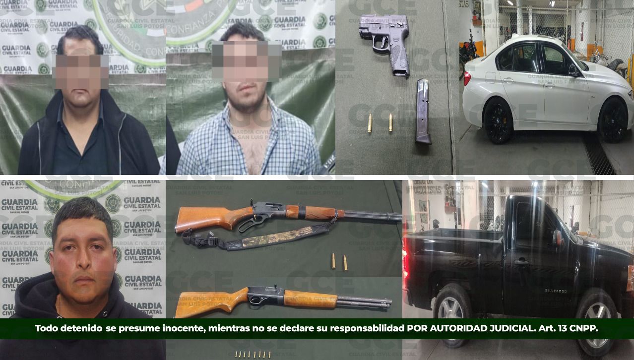 En un hecho distinto, mientras realizaban patrullajes de prevención y disuasión del delito en la zona centro del municipio de Guadalcázar, elementos de la Guardia Civil Estatal interceptaron a Noé “N” de 30 años, y a un adolescente de 15 años, quienes presuntamente portaban armas de fuego.