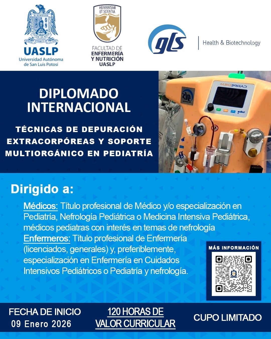 La Facultad de Enfermería y Nutrición (FEN) de la Universidad Autónoma de San Luis Potosí llevará a cabo el Primer Diplomado Internacional en “Técnicas de depuración extracorpóreas y soporte multiorgánico en pediatría”, dirigido a médicas y médicos, así como a enfermeras y enfermeros especializados en pediatría, nefrología pediátrica, medicina intensiva pediátrica, pediatras con interés en temas de nefrología y personal de enfermería en cuidados intensivos.