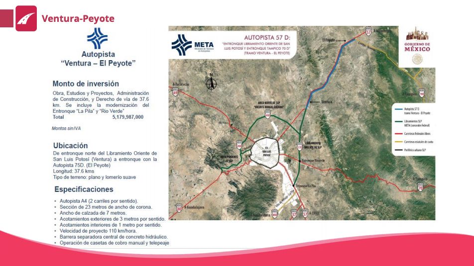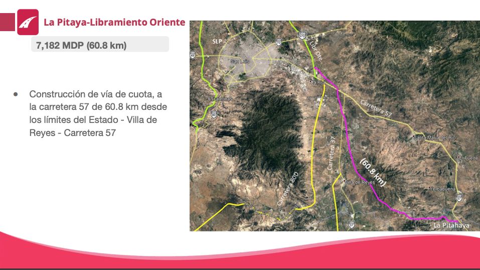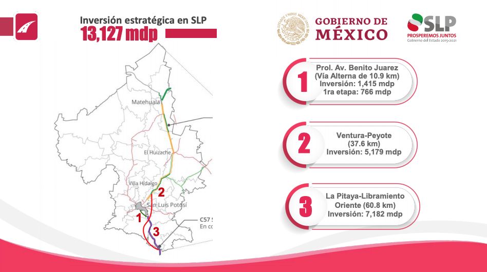 La primera obra para San Luis Potosí es el desdoblamiento de la concesión del libramiento Ventura-El Peyote, que requerirá una inversión de cuatro mil 297 millones de pesos. Además, se construirá el libramiento La Pithaya-Libramiento Oriente, que requerirá una inversión de siete mil 182 millones de pesos.