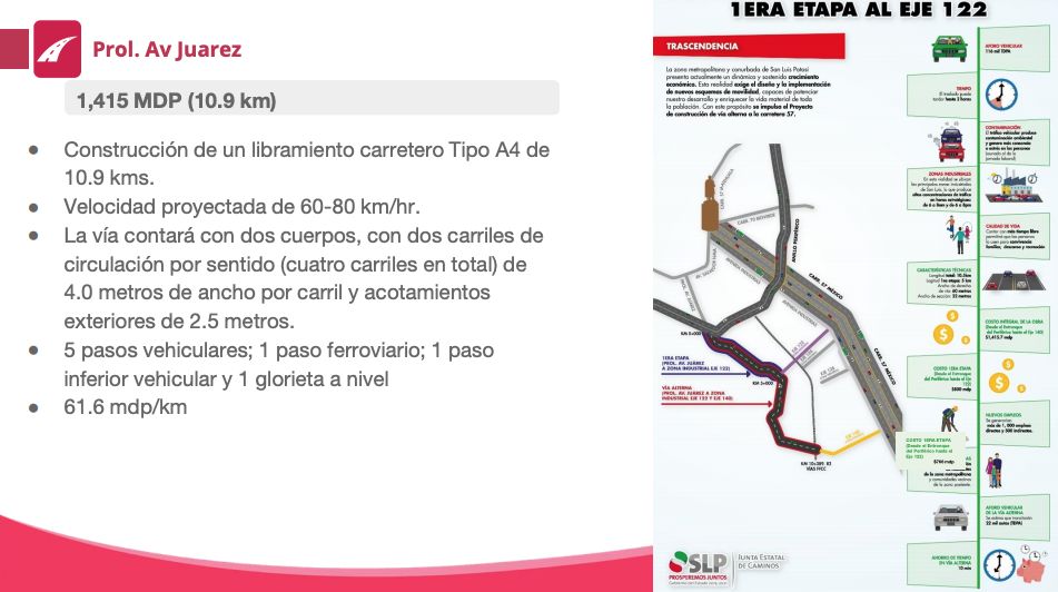 El gobernador del estado, Juan Manuel Carreras López realizó el anunció oficial de la construcción de la ruta alterna Juárez – Zona Industrial. Esta obra se realizará en beneficio de la movilidad en el estado y como respuesta a la necesidad de los potosinos, señaló el mandatario.