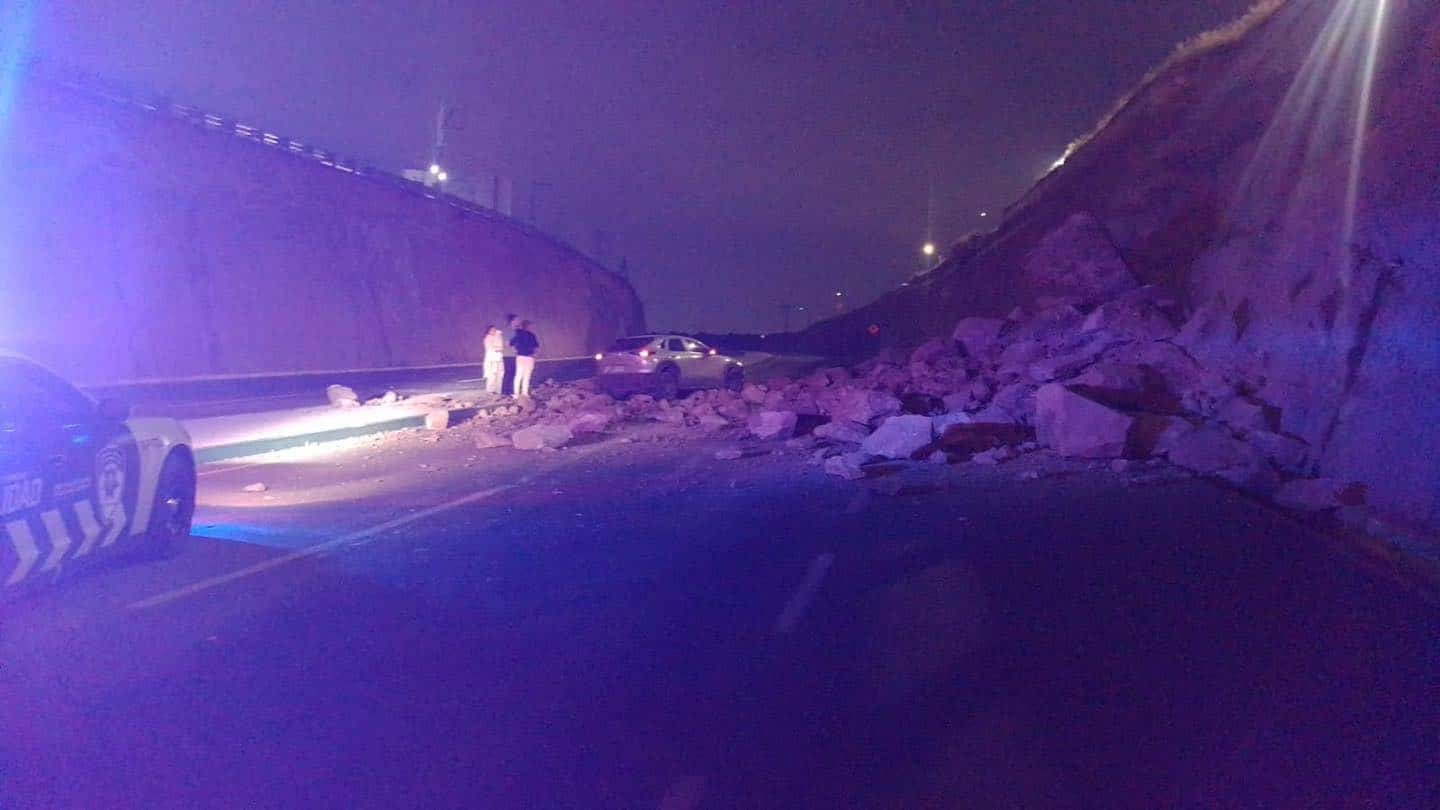 El incidente se registró entre el Circuito Potosí y el fraccionamiento Cerro Azul, cuando parte del muro de contención colapsó, generando la caída de rocas de gran tamaño que bloquearon dos carriles en dirección sur. Un automóvil que circulaba por la zona resultó afectado, aunque no se reportaron personas lesionadas.
