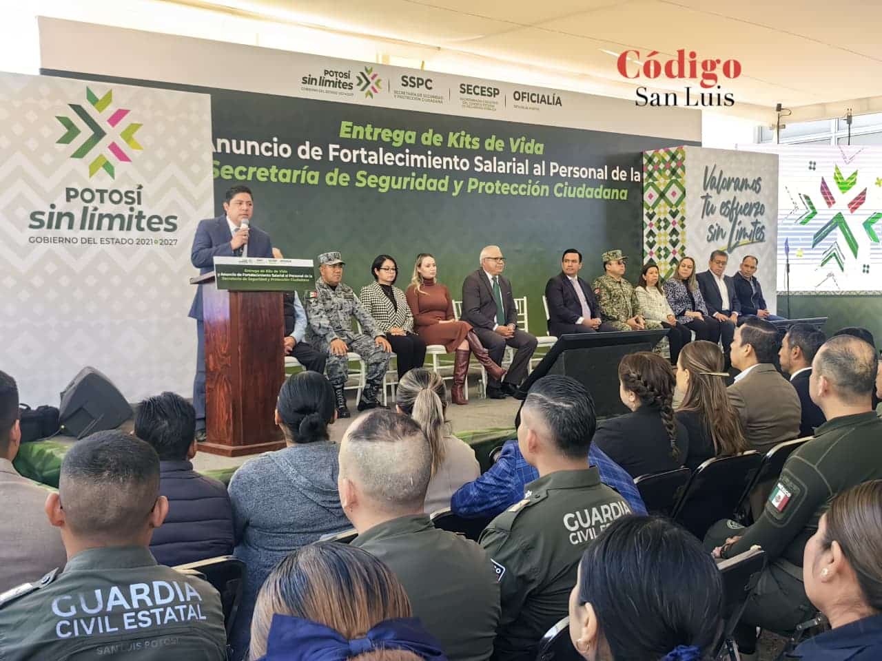 La Secretaría de Seguridad y Protección Ciudadana (SSPC) recibió por parte del Gobierno del Estado encabezado por el gobernador Ricardo Gallardo Cardona, kits de vida y anunció la entrega de un bono operativo para los elementos que están en campo, además de viviendas a los policías caídos en cumplimiento del deber.