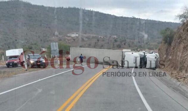 La mañana de este martes se registró la volcadura de un vehículo tipo trailer en el kilometro 110 de la carretera Rioverde – Rayón.