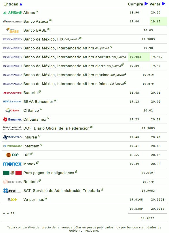 El tipo de cambio en ventanilla se encuentra en $19.13 a la venta en BBVA Bancomer, mientras que Banamex ofrece el dólar en $19.23 y Banorte $18.65