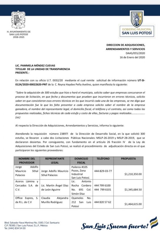 Para evitarse problemas legales y poder darle esta licitación a otro de sus “amiguitos”, el alcalde Nava Palacios se amparó de la Ley de Adquisiciones del Estado, la cual señala que se pueden adjudicar de forma directa contratos menores al millón y medio de pesos. Asignó a José Adolfo Sthal Palacios su contrato y el ayuntamiento declaró como desierta la licitación, todo con el gran apoyo del tesorero Rodri Portilla y la encargada de adquisiciones, quienes sin chistar aprobaron la compra.