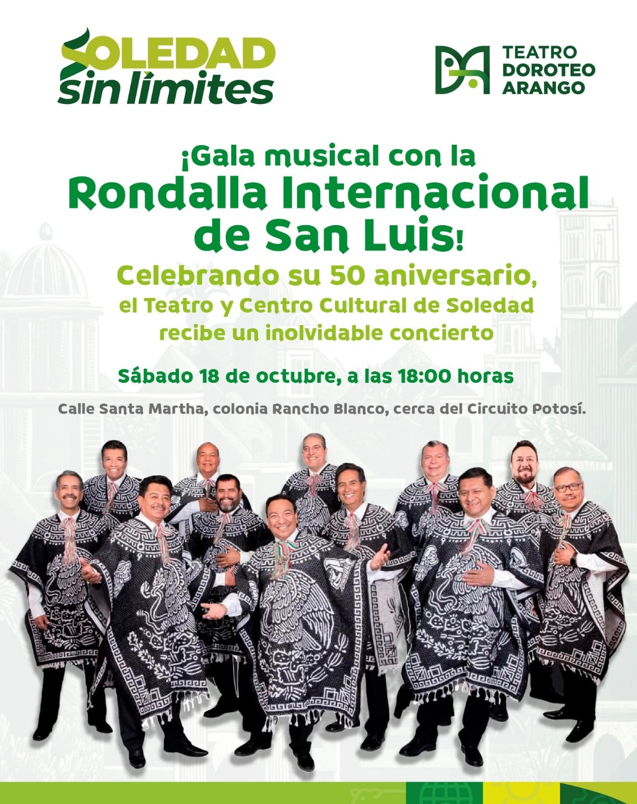 El Ayuntamiento de Soledad de Graciano Sánchez lleva la cultura y el arte al corazón de las familias, mediante el impulso del concierto de la Rondalla Internacional de San Luis, que celebra 50 años cantando al amor y dejando huella en generaciones con su estilo inconfundible; este evento de gran relevancia busca acercar a la población espectáculos de calidad, fomentar la convivencia familiar y fortalecer el orgullo por el talento local que distingue a Soledad, atendiendo la visión del Alcalde Juan Manuel Navarro Muñiz.