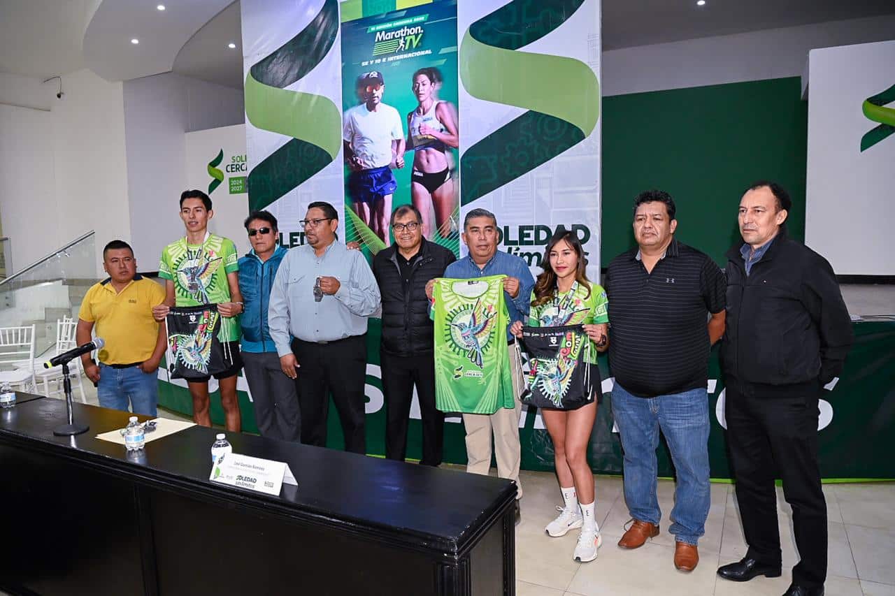 Juan Manuel Navarro Muñiz, Alcalde de Soledad de Graciano Sánchez, encabezó la presentación oficial de la playera y medalla del Marathón TV 2025, en una rueda de prensa que se realizó en el Auditorio municipal; uno de los eventos atléticos más importantes del país, que se llevará a cabo este fin de semana en el Parque Tangamanga II, donde se destacó la calidad internacional de esta competencia que atraerá a corredores de distintos países de Centro y Sudamérica.