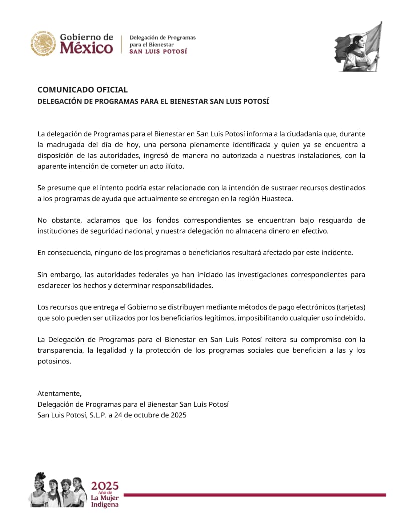 Tras los hechos, la Secretaría del Bienestar emitió un comunicado en el que detallan que el presunto responsable del saqueo ya fue consignado ante las autoridades; aseguraron que estas oficinas no almacenan dinero en efectivo.