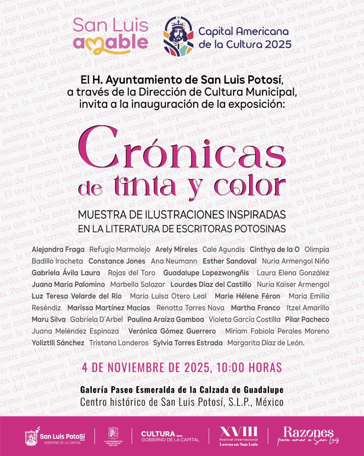“Esta exposición nos recuerda que la literatura y las artes visuales comparten un mismo propósito: dar sentido al mundo y ampliar nuestra mirada sobre él. Crónicas de tinta y color es una muestra del talento potosino y de la vitalidad cultural que define a nuestra ciudad”, expresó Martín Juárez Córdova, Director de Cultura Municipal.