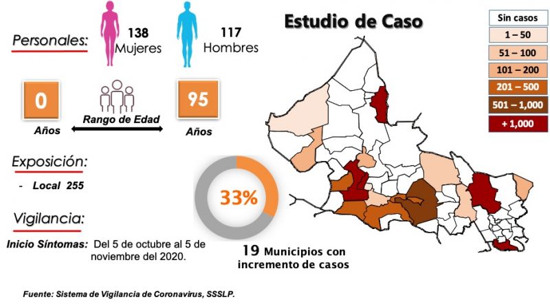 Autoridades sanitarias informaron que los nuevos positivos corresponden a 138 mujeres y 117 hombres en rango de edad 0 a 95 años. Los síntomas covid se presentaron del 5 de octubre al 5 noviembre en 19 municipios de la entidad.