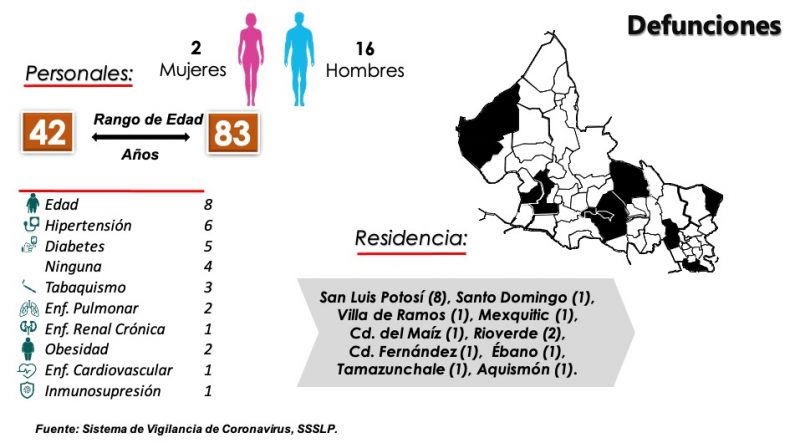 En cuanto a los nuevos fallecidos, la cifra corresponde a 16 hombres y 2 mujeres en rango de edad 42 a 83 años. Los pacientes contaban con factores de riesgo como: diabetes, edad, hipertensión, obesidad, enfermedad pulmonar, enfermedad renal crónica, inmunosupresión o enfermedad cardiovascular. En cuatro de los casos no tenían enfermedades previas ni factores de riesgo.