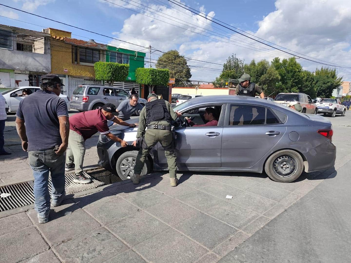 Elementos de la Guardia Civil Estatal brindaron apoyo a un ciudadano luego de que su vehículo quedara inmovilizado al caer en un canal, tras romperse una rejilla de alcantarillado mientras buscaba un espacio para estacionarse.