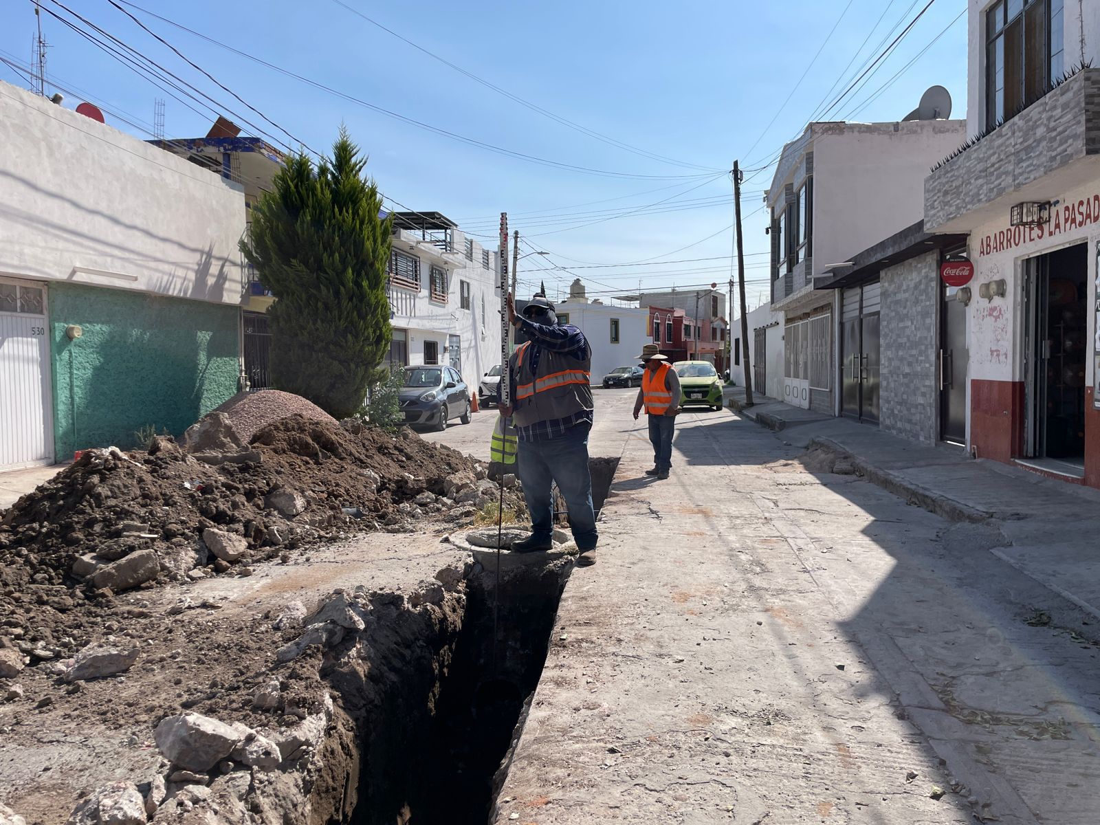 SLP.– INTERAPAS comenzó la rehabilitación de 50 metros de drenaje sanitario en la calle Baja California Sur, entre Yucatán y Sonora, en la colonia Popular.