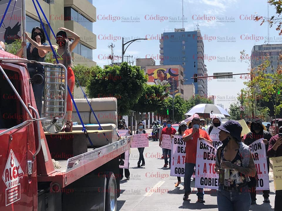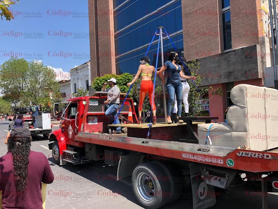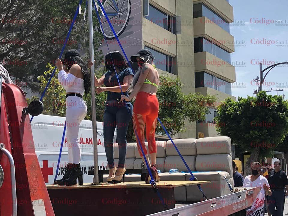 Esta mañana las calles de la capital potosina fueron nuevamente tomada por bailarinas exóticas, quienes piden se reabran los establecimientos nocturnos donde desempeñan su honrada profesión. Una caravana de antreros, trabajadores y bailarinas se desplazó por las principales calles del centro histórico, mientras realizaban un demostración de sus habilidades en el tubo.