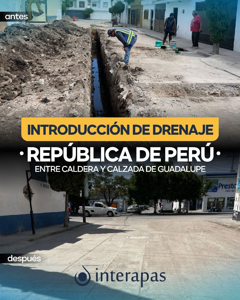 SLP.– INTERAPAS concluyó la instalación y conexión del nuevo sistema de drenaje sanitario en la calle República de Perú, entre Caldera y Calzada de Guadalupe, en la colonia Santuario, beneficiando a más de 150 habitantes que por primera vez contarán con este servicio esencial en sus hogares.