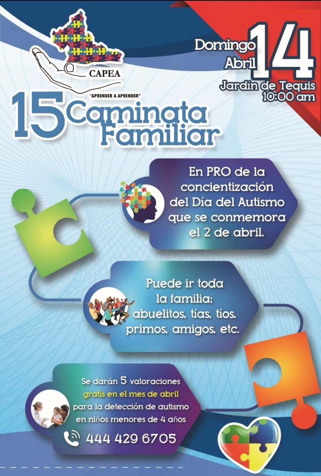 El Centro Educativo y Terapéutico para niños con Autismo, Capea, A.C. hace una atenta invitación a todos los interesados en tomar parte a la 15ª Caminata Familiar que se estará desarrollando el próximo domingo 14 de abril en donde se espera que se den cita un buen número de atletas, y familias en general.
