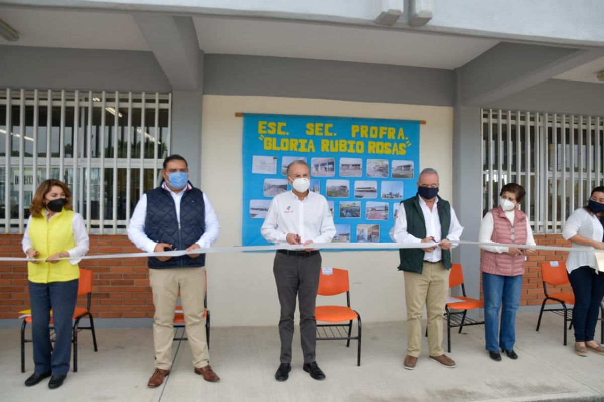 En la Escuela Secundaria Profesora Gloria Rubio Rosas del Fraccionamiento Villa Real de Santiago, el jefe del Ejecutivo estatal, inauguró 3 aulas didácticas y supervisó los avances de una más, después, el Secretario de Educación, Joel Ramírez Díaz, indicó que en el municipio se aplican 206.6 millones de pesos para realizar 254 obras y equipamientos en 147 escuelas de educación básica, media superior y superior, a las que asiste el 64 por ciento de las y los alumnos del municipio, “en total, esta escuela ha recibido una inversión de más de 7 millones 916 mil pesos”, dijo.