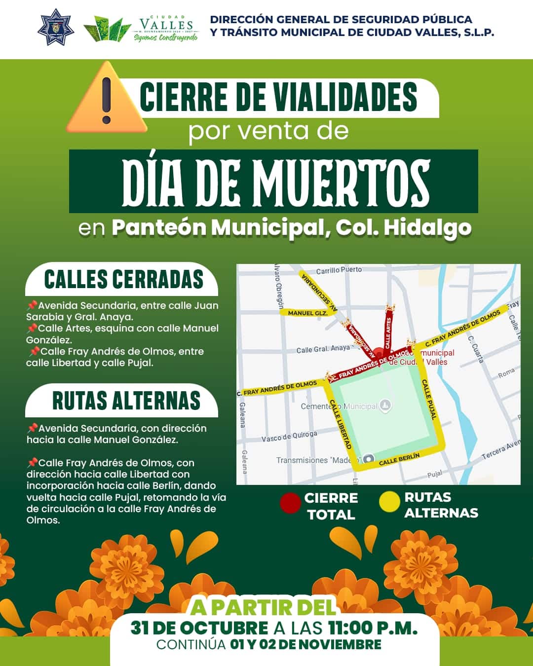 Ciudad Valles, S.L.P.– La Dirección General de Seguridad Pública y Tránsito Municipal informó que, con motivo de la venta especial por el Día de Muertos en la periferia del Panteón Municipal de la colonia Hidalgo, se realizarán cierres parciales de calles para proteger a peatones, comerciantes y automovilistas durante este fin de semana.