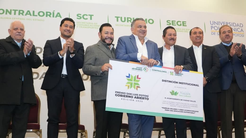 Ciudad Valles, S.L.P.- Este viernes el Presidente Municipal de Ciudad Valles, David Armando Medina Salazar, recibió una distinción institucional por la participación que tuvo el municipio en la edición 2025 del Premio “San Luis Potosí de Gobierno Abierto” con el proyecto “Paneles solares y aires acondicionados para una educación sustentable”.