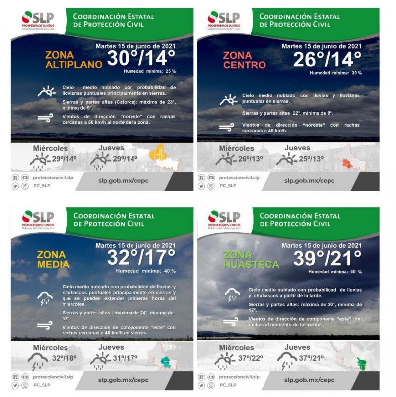 Para la capital potosina pronostican 26 grados de temperatura máxima y mínima de 14, cielo medio nublado y rachas de viento de hasta 40 km/h con dirección noreste.