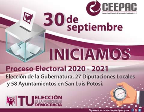 El proceso electoral 2020-2021 inicia en San Luis Potosí el próximo 30 de septiembre de 2020 con la sesión pública de instalación del Consejo General del Consejo Estatal Electoral y de Participación Ciudadana (CEEPAC).
