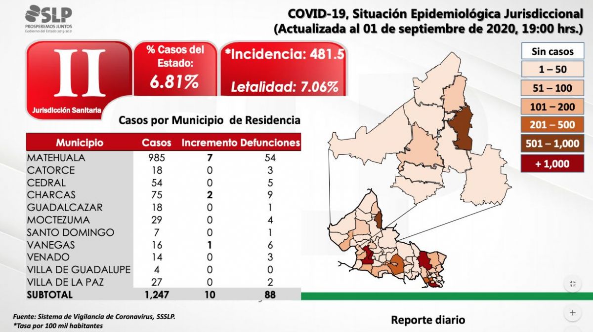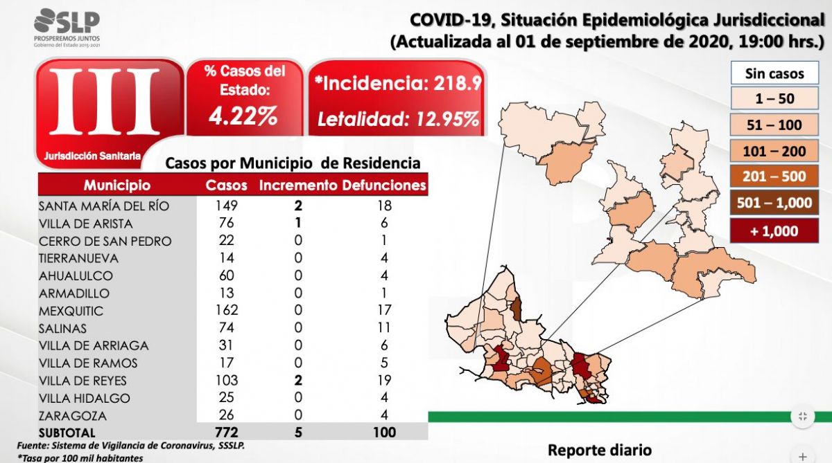 Los municipios con el mayor número de muertes covid son SLP capital, Soledad de Graciano, Ciudad Valles y Tamazunchale.